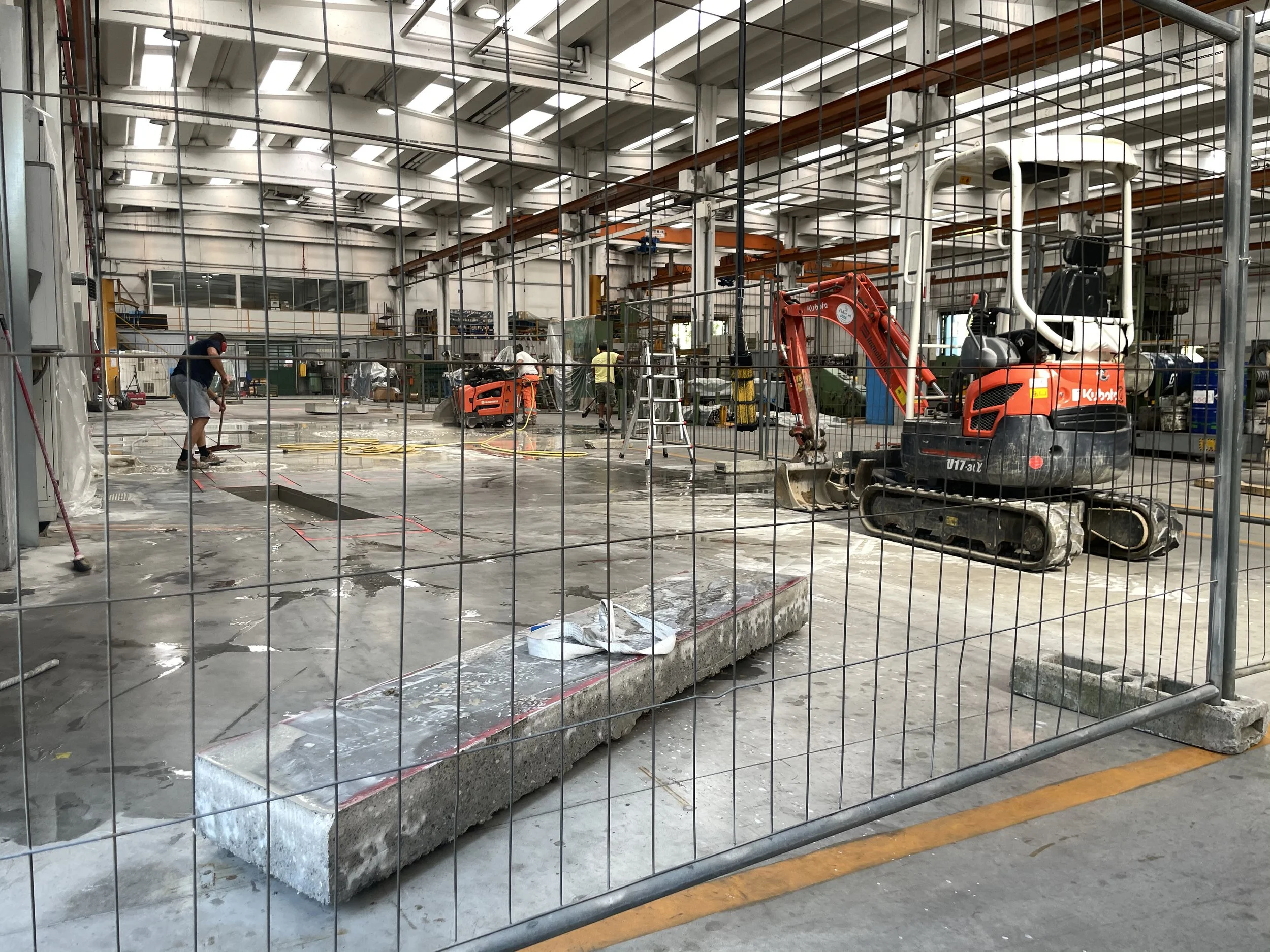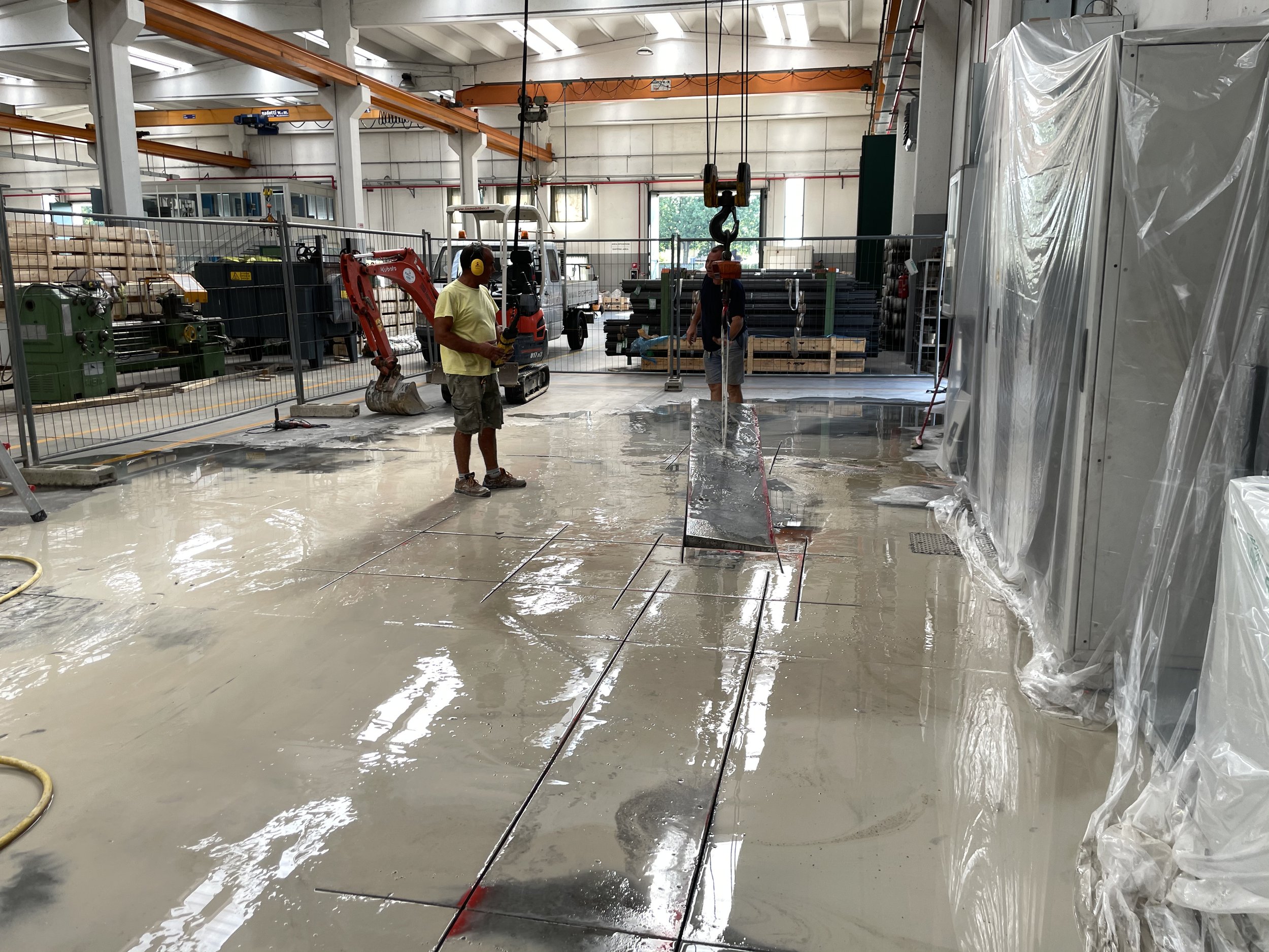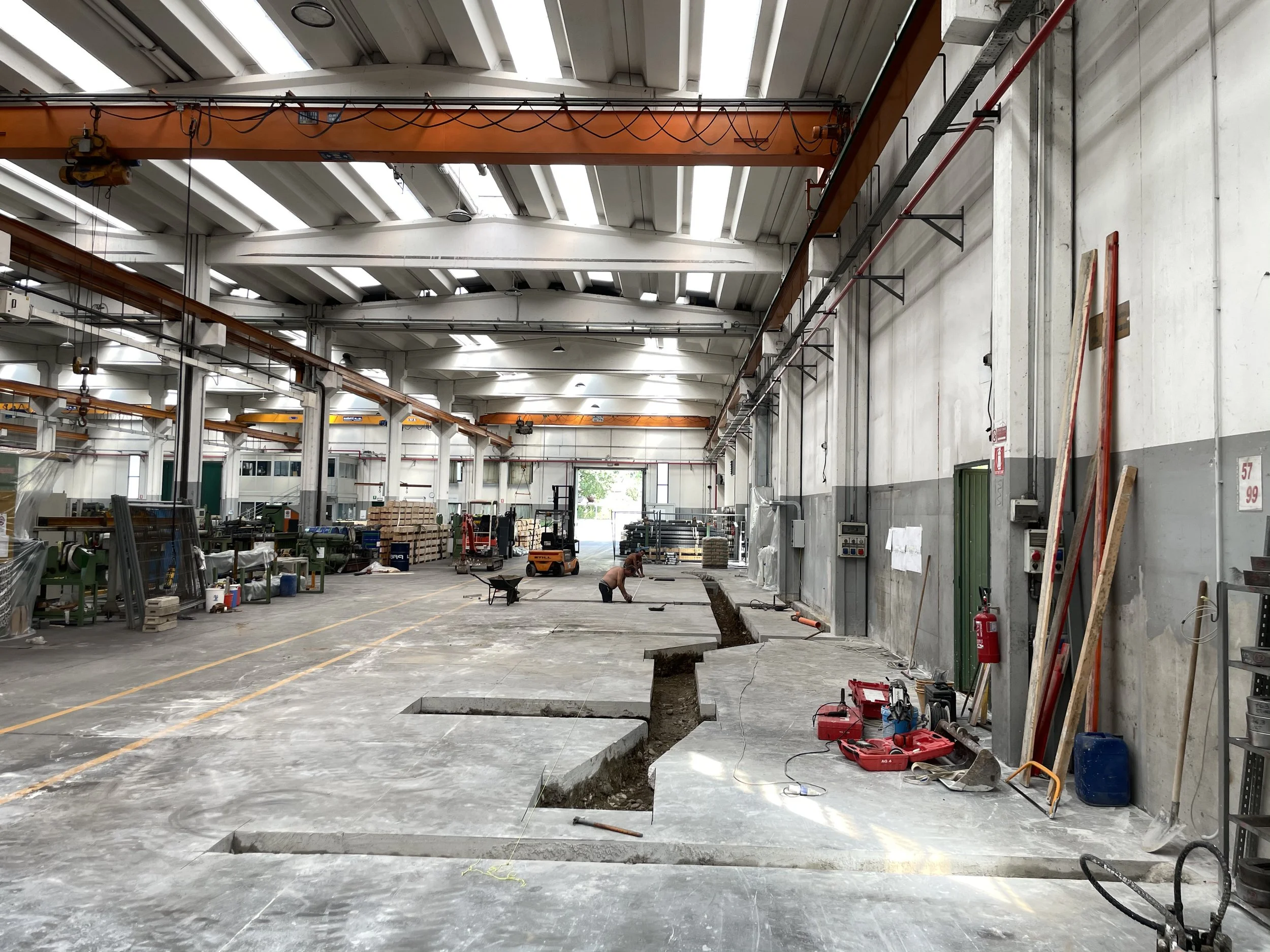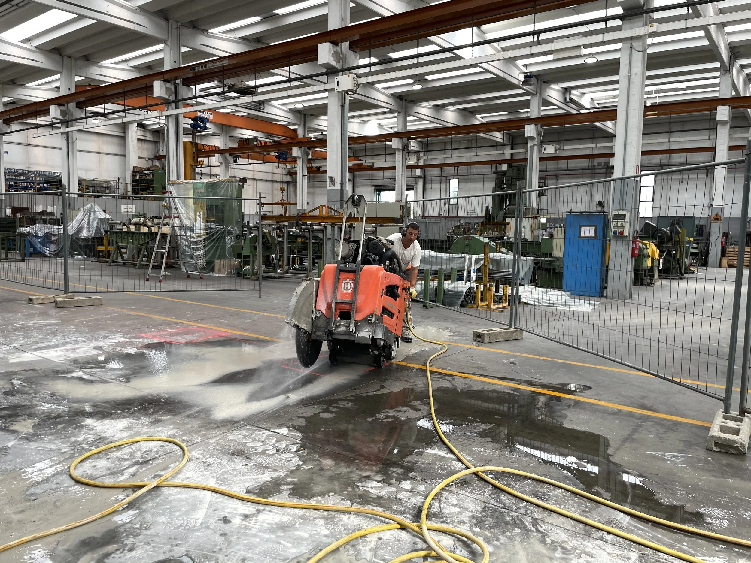 L’operazione ha richiesto il taglio del pavimento industriale esistente e la successiva realizzazione di una base rinforzata, progettata per garantire la massima stabilità e resistenza alle sollecitazioni meccaniche. L’intervento viene eseguito in parallelo alle attività produttive, consentendo al reparto di rimanere operativo senza interruzioni. Grazie a un’attenta pianificazione e all’impiego di soluzioni tecniche mirate, stiamo integrando il nuovo impianto nel contesto produttivo, ottimizzando efficienza e affidabilità operativa.